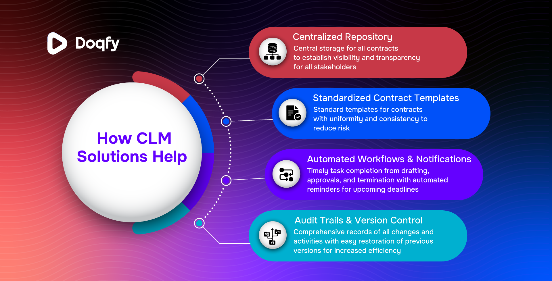 To support these needs and improve your contract management practices, Doqfy offers AI-backed, tailored CLM tools designed to meet your specific requirements. Book a demo with us today for the best Contract Management experience possible.